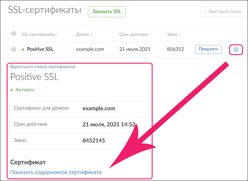 - Если вы создавали CSR в личном кабинете, для получения приватного ключа нужно перейти в раздел «SSL-сертификаты» и нажать на шестеренку. В настройках заказа и будет виден приватный ключ, после нажатия на кнопку «Показать содержимое сертификата»: