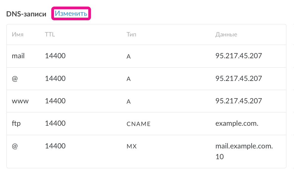 Чтобы добавить запись для поддомена (например www.example.com), в поле "Имя" впишите только имя поддомена, например www.
