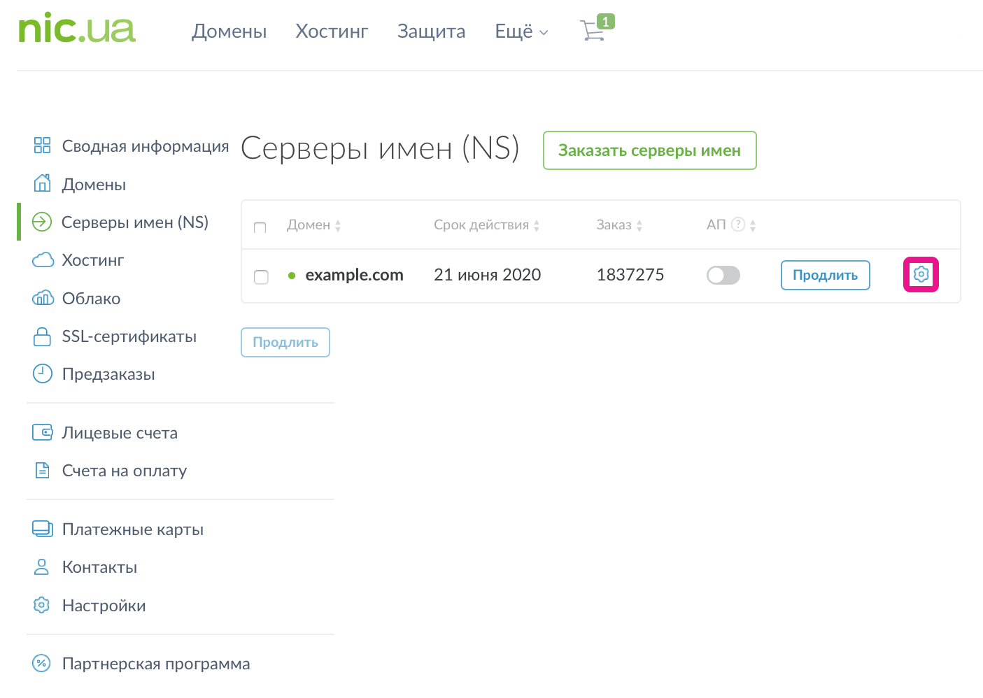 После этого перейдите в раздел "Серверы имен (NS)" и нажмите на шестеренку возле серверов имен для домена.