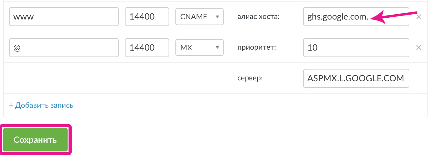 ⚠️ Обратите внимание, в конце значения записи (поле "алиас хоста" или "сервер") обязательно поставьте точку. Тогда адрес будет абсолютным. Если не поставить точку, то запись будет относительной и в конце будет автоматически добавляться имя вашего домена.