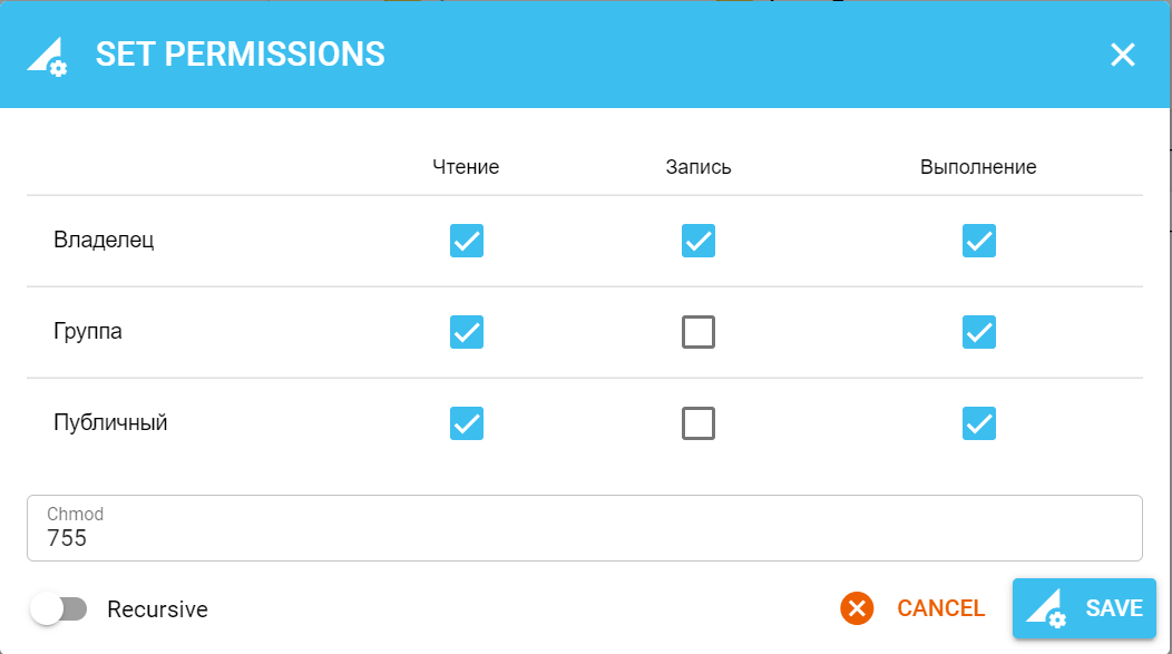 Для папок установите разрешения со значением "755" как на изображении ниже. Затем нажмите кнопку "Save".