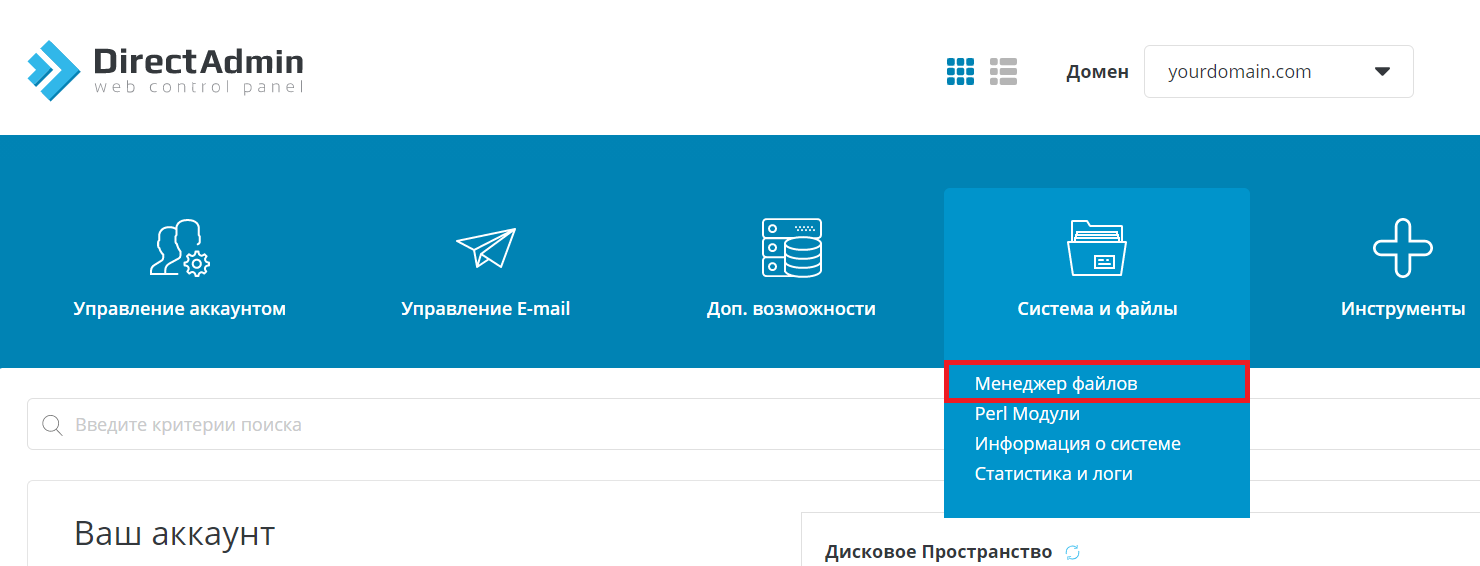 В панели хостинга найдите раздел "Система и файлы" и выберите пункт "Менеджер файлов".