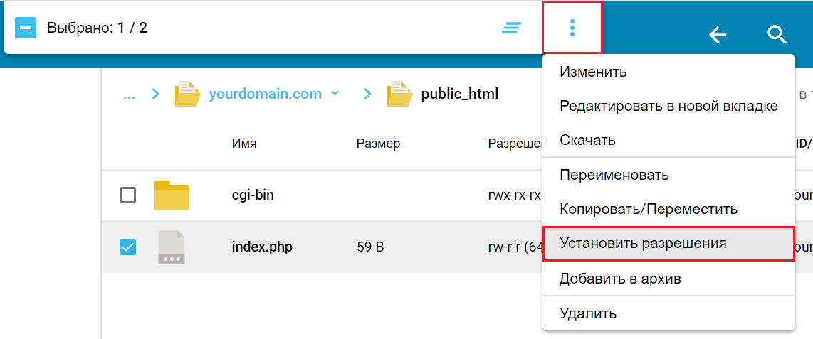 Почему следует устанавливать корректные права на файлы и папки рассмотрели в статье "Права доступа к файлам и папкам на хостинге". В этой статье рассмотрим как изменить их в панели хостинга через менеджер файлов.