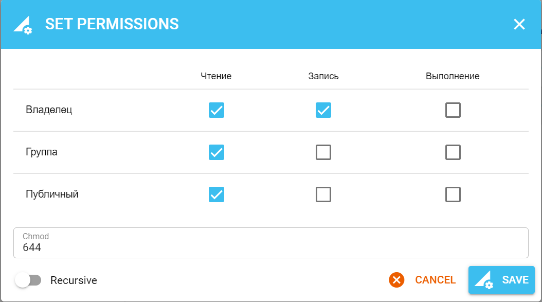 Для файлов установите разрешения со значением "644" как на изображении ниже. Затем нажмите кнопку "Save".