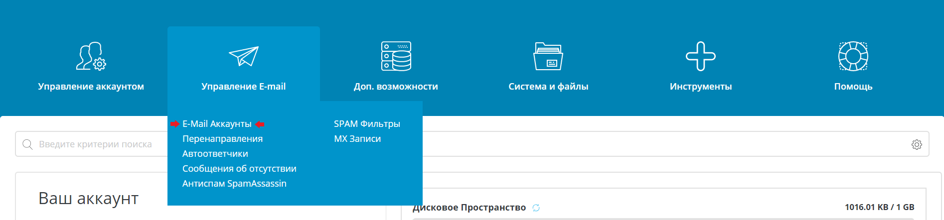 Сначала перейдите в панель хостинга DirectAdmin и выберите в разделе "Управление E-mail" пункт "E-Mail Аккаунты".