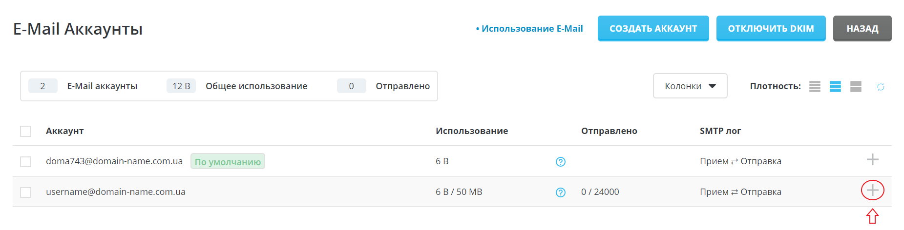 Далее напротив выбранной учетной записи нажмите на кнопку в виде знака "Плюс" (обведена кругом красного цвета).
