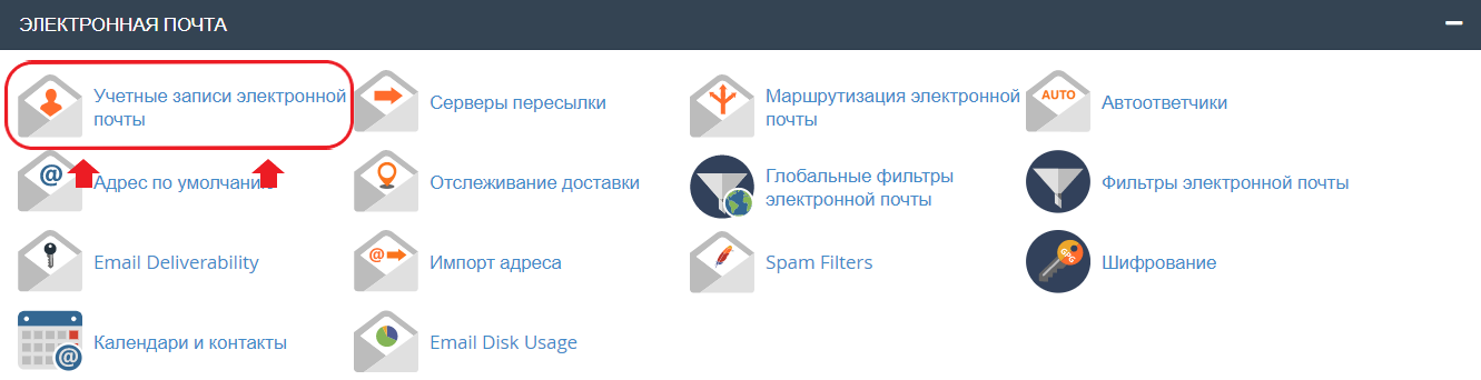 Для этого изначально перейдите в панель хостинга и в разделе "Электронная почта" выберите пункт "Учетные записи электронной почты".