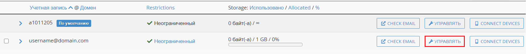 Напротив необходимой учетной записи нажмите на кнопку "Управлять".