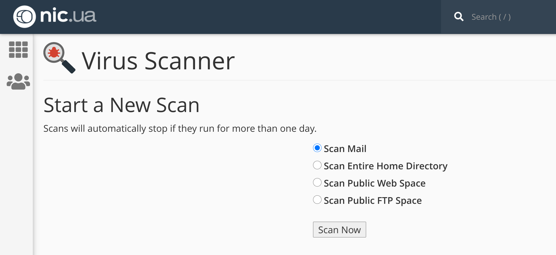 У вас откроется окно данной утилиты, где выбираете, какую именно область хостинг аккаунта желаете проверить на вирусы. Выбрав нужную опцию нажимаете "Scan Now".