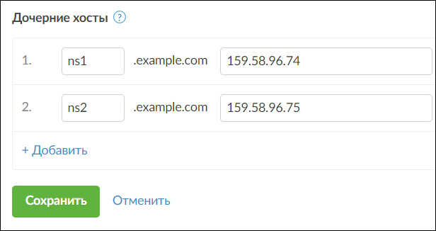 Найдите на странице раздел «Дочерние хосты» и нажмите «Добавить» чтобы внести имя и IP-адрес вашего сервера имен. После того как внесли все необходимые данные, нажмите «Сохранить».