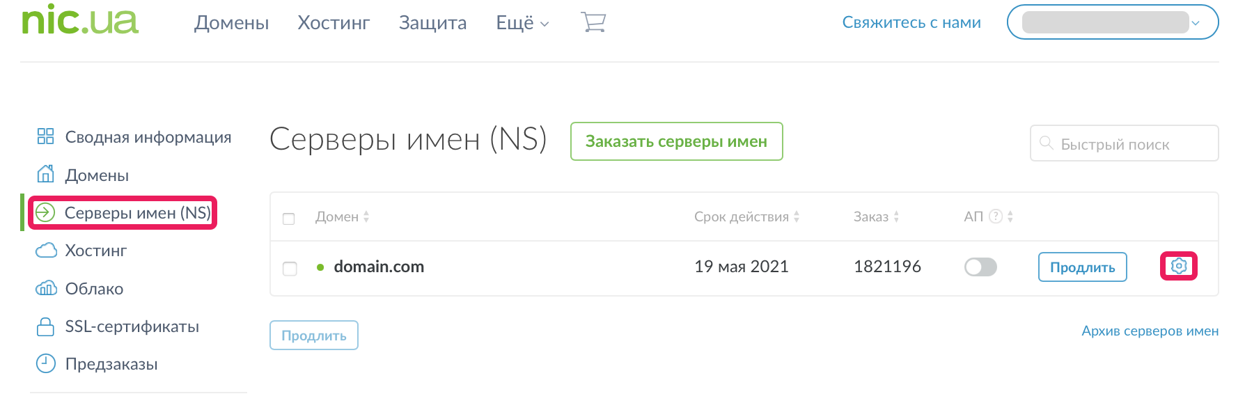Для того, чтобы добавить запись на эти NS-серверы перейдите в раздел "Серверы имен (NS)" и нажмите на шестеренку справа от заказа.