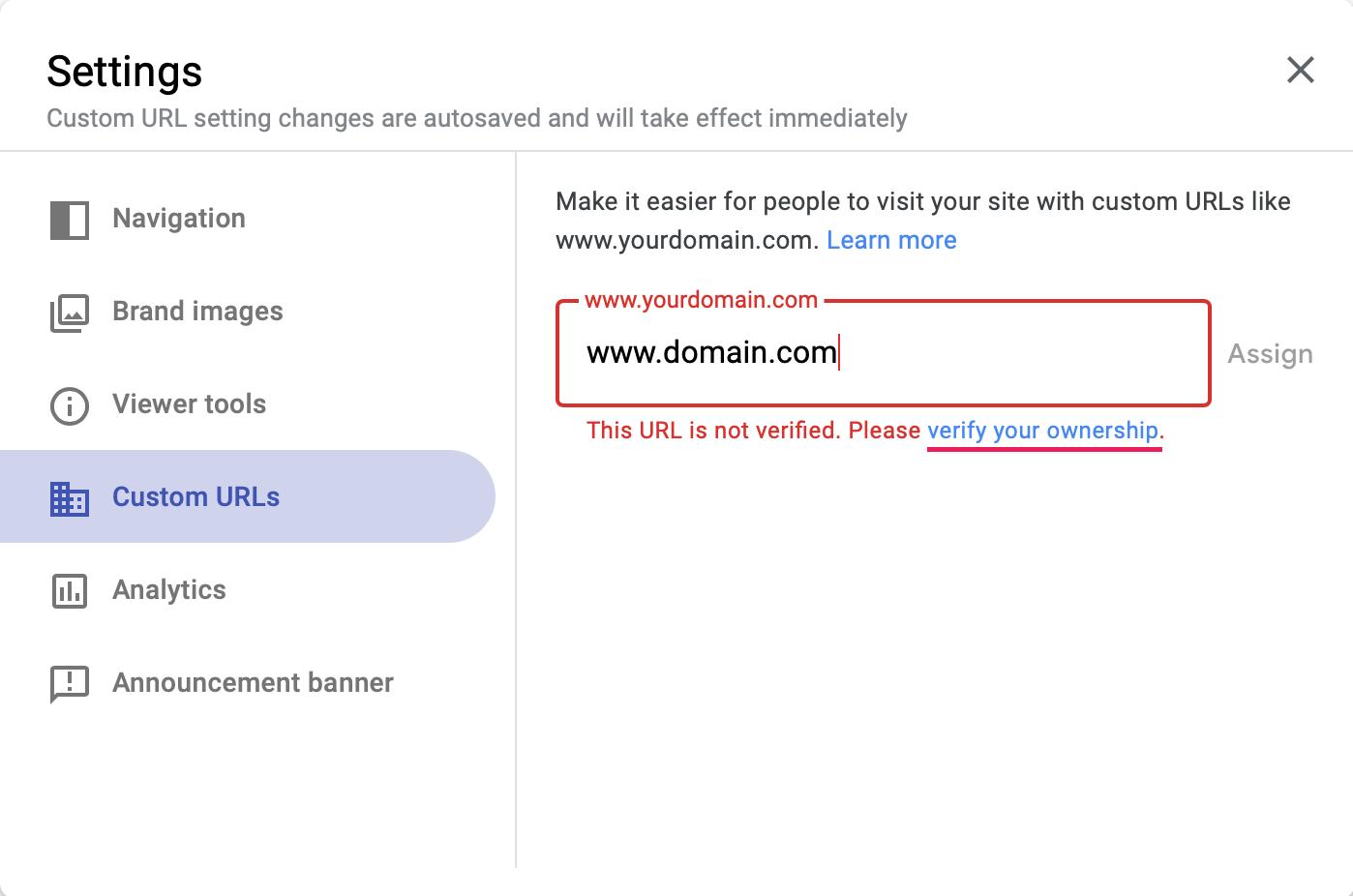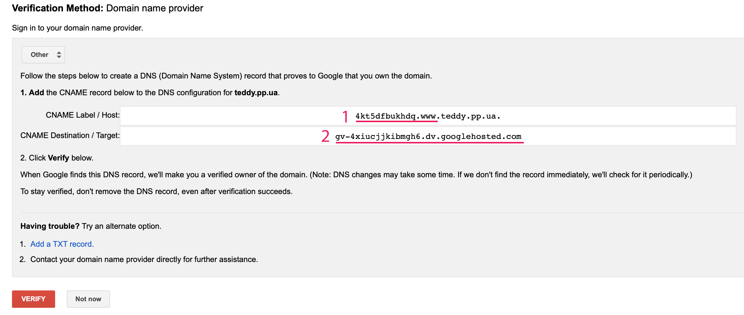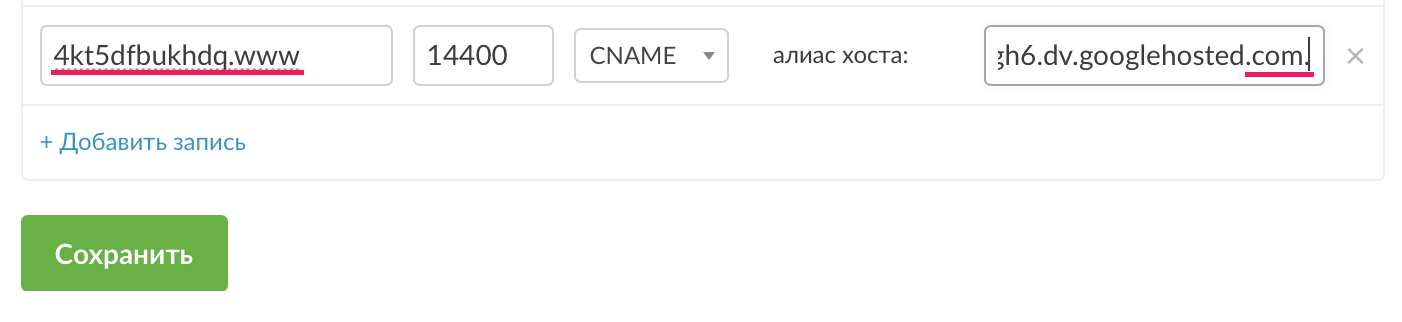 Рассмотрим подтверждение права собственности на домен при помощи CNAME-записи для Google Sites.