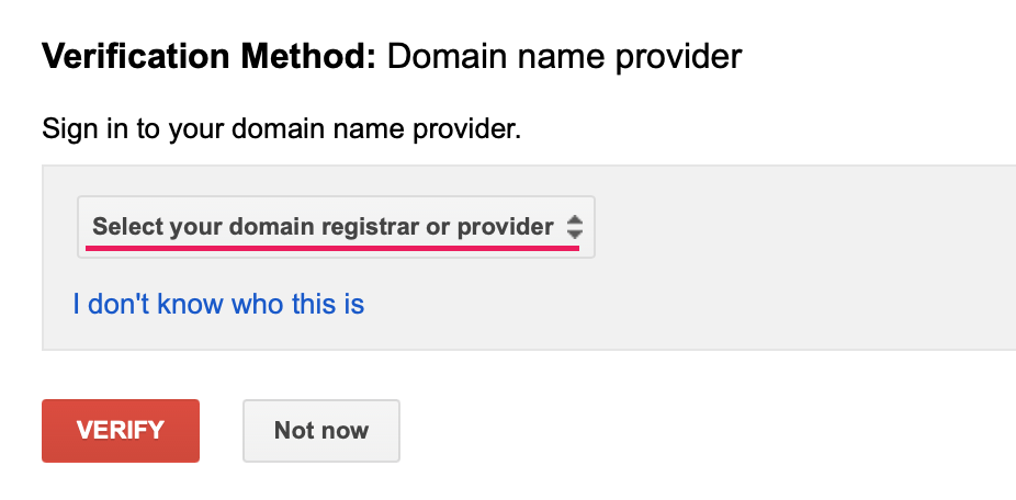При переходе на страницу подтверждения (ссылка verify your ownership) вам будет предложено выбрать вашего регистратора. В списке выберите "Другой" или "Other".
