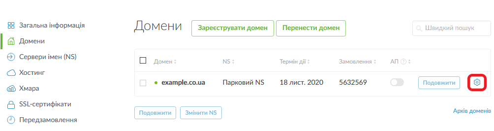 Чтобы их добавить, откройте раздел «Домены» и перейдите к настройкам NS-серверов, нажав на шестеренку возле домена: