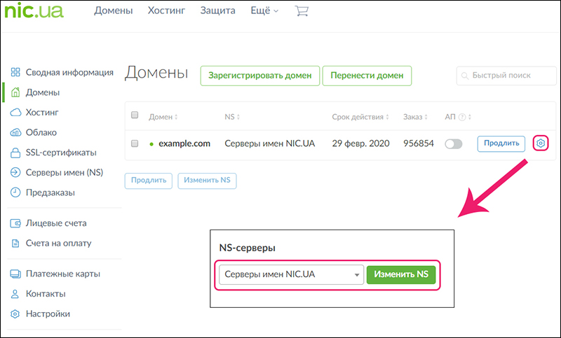 - Перейдите в раздел «Домены» и нажмите на шестеренку у нужного домена. В разделе «NS-серверы» выберите «Серверы имен NIC.UA», нажмите «Изменить NS».