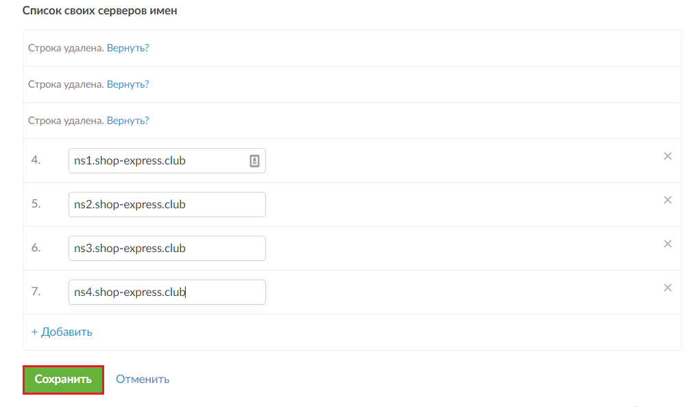 Возле пункта "Список своих серверов имен" нажмите кнопку "Изменить". Затем удалите из списка текущие хосты и добавьте следующие: