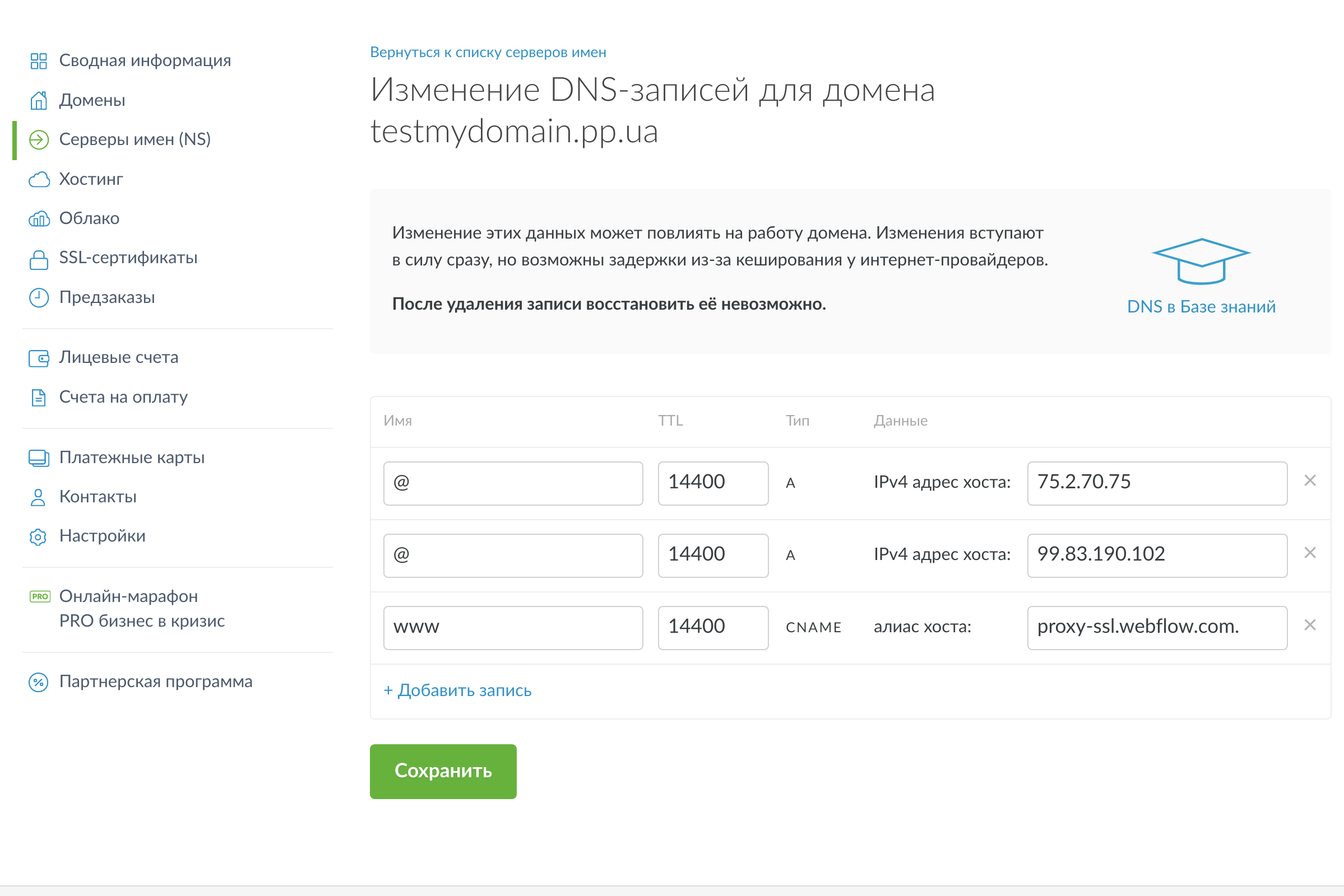www 14400 CNAME proxy-ssl.webflow.com. (в конце с точкой).