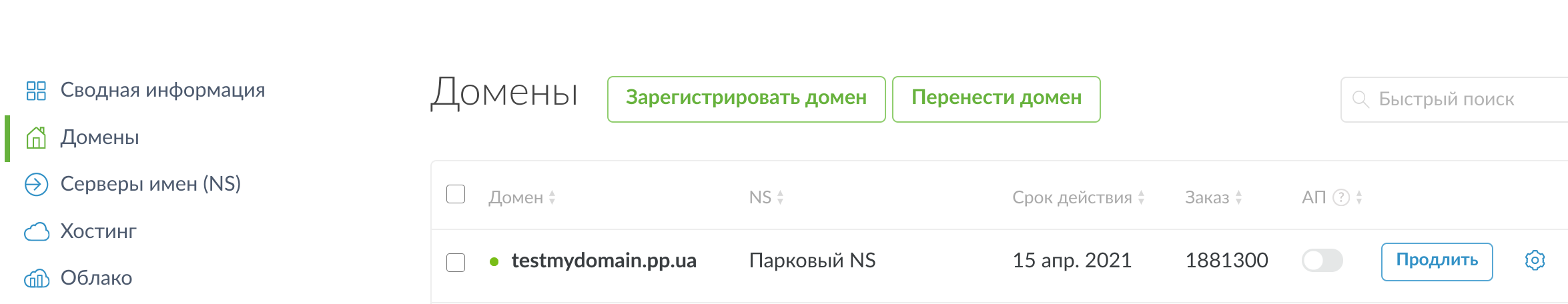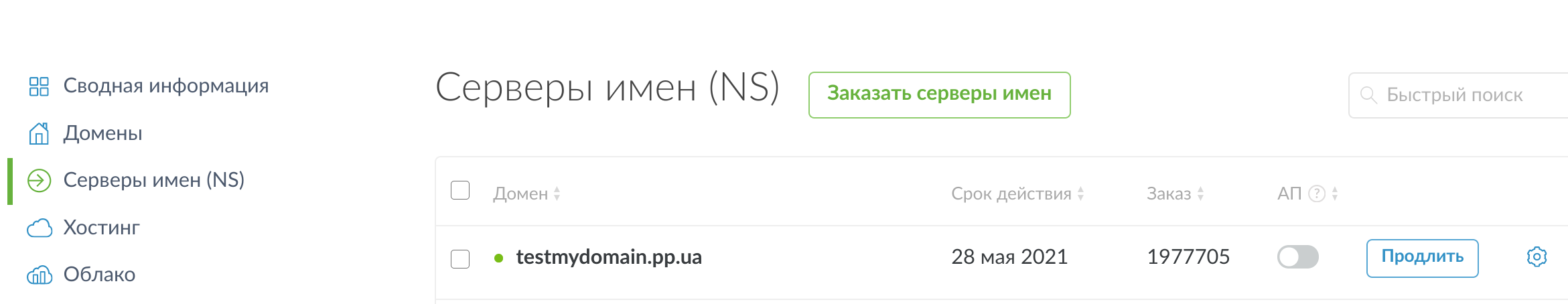 1. Перейдите в раздел «Домены» и нажмите на шестеренку у нужного домена. В разделе «NS-серверы» выберите "Серверы имен NIC.UA", нажмите "Изменить NS".