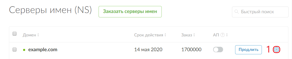 2. Підтвердження права власності на домен і його прив'язка до сайту Підтверждення права власності на домен виконується за допомогою додавання TXT-запису. Для цього перейдіть до розділу "Сервери імен (NS)" і натисніть на шестреню біля замовлення (1).