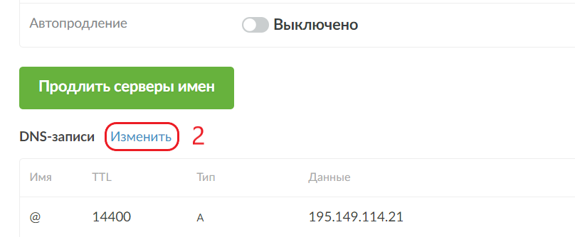 Нижче на сторінці натисніть на кнопку "Змінити" (2) біля заголовку "DNS-записи".