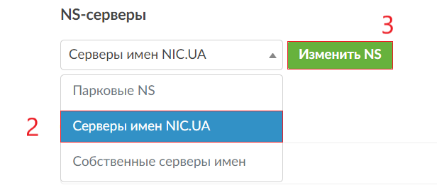 Затем выберите в разделе "NS-серверы" из списка пункт "Серверы имен NIC.UA" (2). Затем нажмите на кнопку "Изменить NS" (3) и дождитесь загрузки страницы.