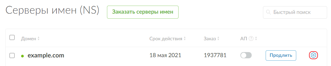 2. Редактирование DNS-записей на серверах имен На следующем шаге перейдите в раздел "Серверы имен (NS)" и нажмите на шестеренку (1) возле заказа.