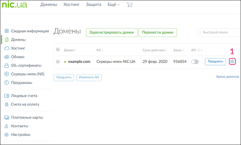 Для этого требуется прописать серверы имен в домене: откройте раздел «Домены» и нажмите на шестеренку возле вашего домена.