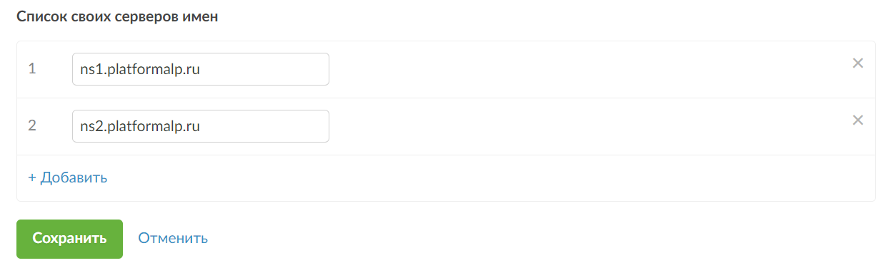 Теперь вам доступно редактирование списка NS-серверов. Вместо текущих вам нужно вставить такие серверы имен: ns1.platformalp.ru, ns2.platformalp.ru — в "Список своих серверов имен".