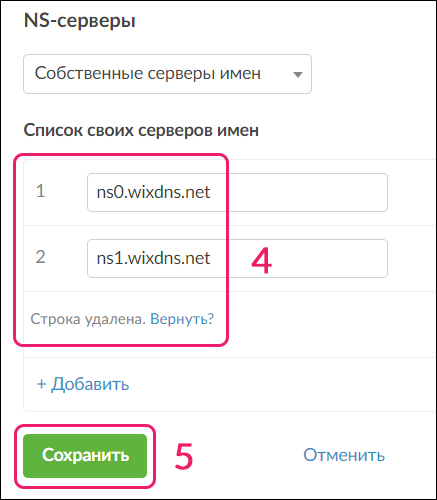Теперь вам доступно редактирование списка NS-серверов. Вместо текущих вам нужно вставить серверы имен WIX: они могут быть уникальны для каждого сайта. Чтобы узнать, какие серверы имен нужно внести для вашего сайта, вам стоит воспользоваться этой инструкцией или обратиться в поддержку WIX.