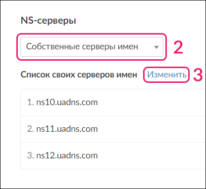 Попав на страницу настроек, опуститесь к разделу «NS-серверы». Вам нужно выбрать из выпадающего списка «Собственные серверы имен» и затем нажать на кнопку «Изменить» для их редактирования: