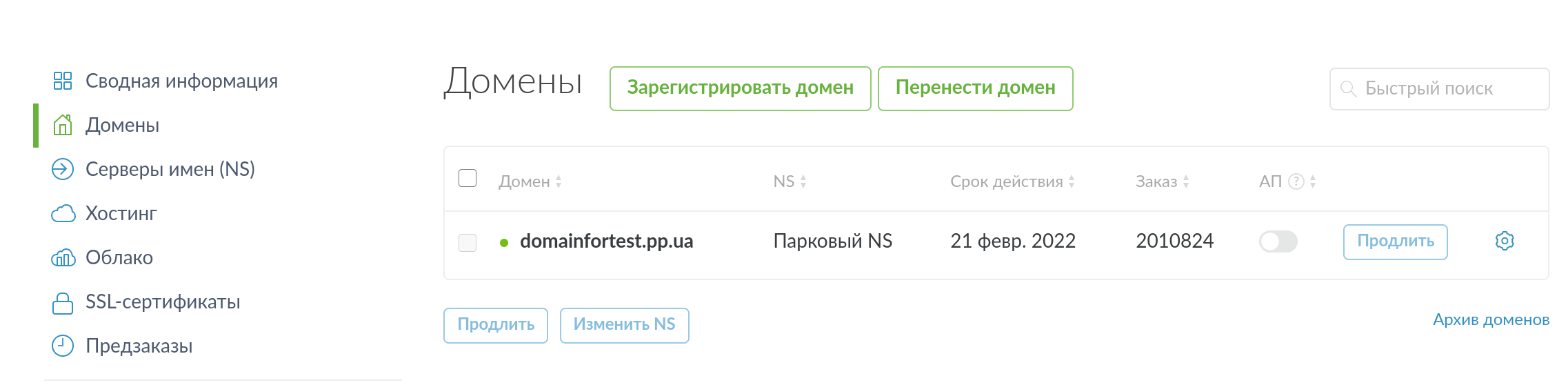Для этого сначала перейдите в раздел "Домены" личного кабинета NIC.UA и нажмите на кнопку в виде шестеренки возле заказа на нужный домен.