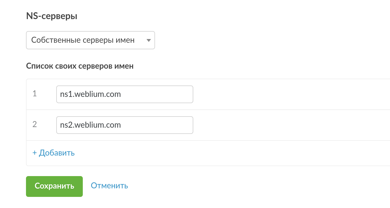 Возле пункта "Список своих серверов имен" нажмите кнопку "Изменить". Затем удалите из списка текущие NS и добавьте следующие: