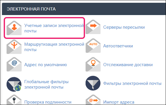 Для создания email, откройте панель управления хостингом и найдите раздел «Электронная почта». Вам нужен пункт «Учетные записи электронной почты»: