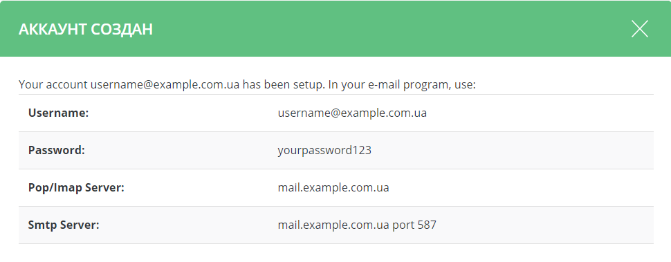 В результате успешного создания почтового ящика, получите уведомление такого плана: