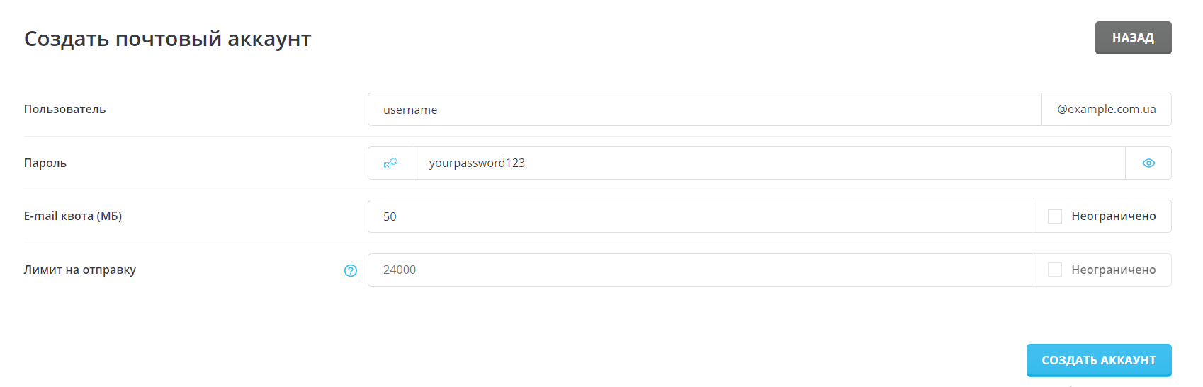 Заполните необходимые поля формы. Вместо 'username' укажите имя учетной записи, которую хотите создать, в поле ниже укажите пароль для доступа к почтовому ящику.
