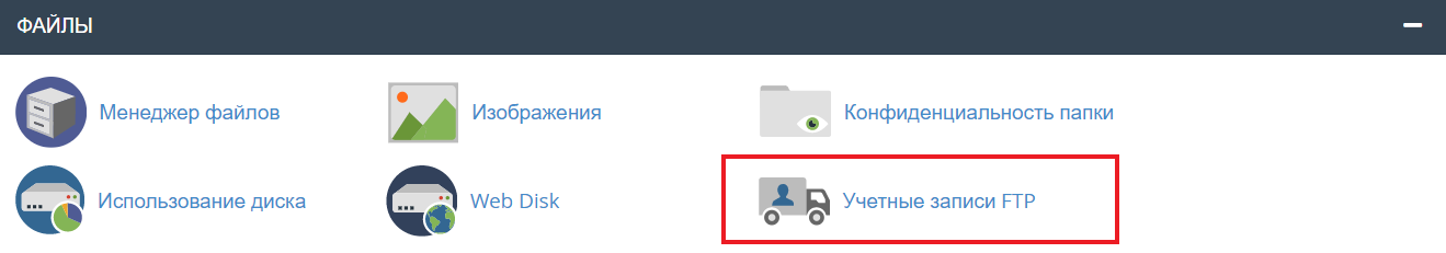 Для этого в панели хостинга cPanel найдите раздел "Учетные записи FTP".