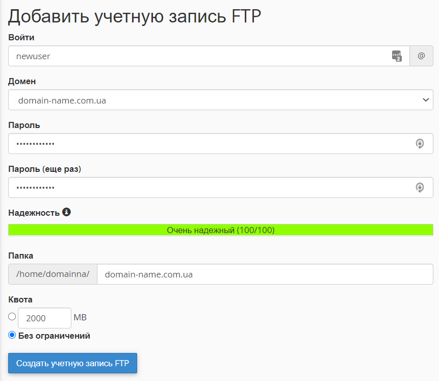 После заполнения всех необходимых полей нажмите кнопку "Создать учетную запись FTP"