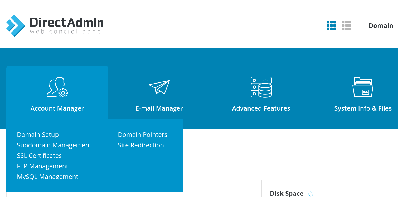 Открываем панель управления хостингом DirectAdmin. Наводим курсор на пункт первого меню "Account Manager" и выбираем "MySQL Management".