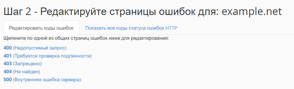 На следующем шаге выберите для какой ошибки желаете отредактировать код страницы. По умолчанию отображается список стандартных ошибок. При этом можете переключиться на вторую вкладку, если желаете отредактировать шаблоны для других ошибок.
