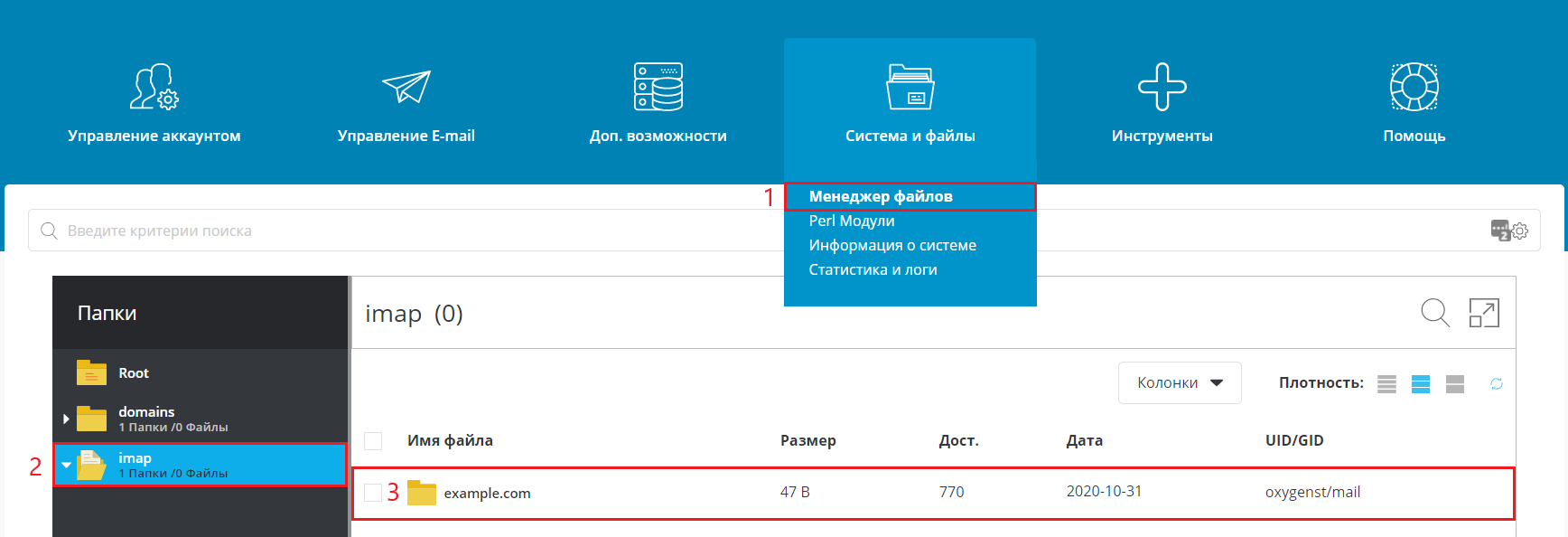 Сначала войдите в панель хостинга DirectAdmin и перейдите в Менеджер файлов (1) раздела "Система и файлы". В менеджере файлов перейдите в папку imap (2) и выберите папку с именем домена (3).