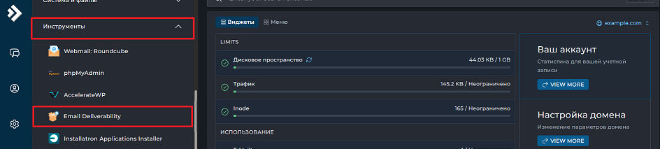 Перейдите в панель хостинга DirectAdmin и выберите раздел "Инструменты": в нем выберите подраздел "Email Deliverability".
