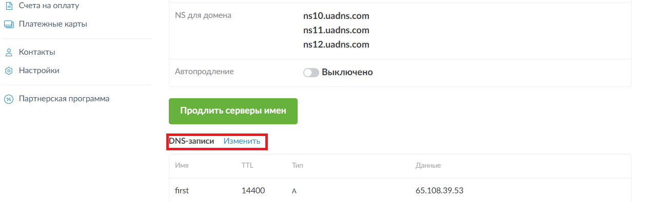 В свойствах заказа найдите заголовок "DNS-записи" и нажмите кнопку "Изменить".