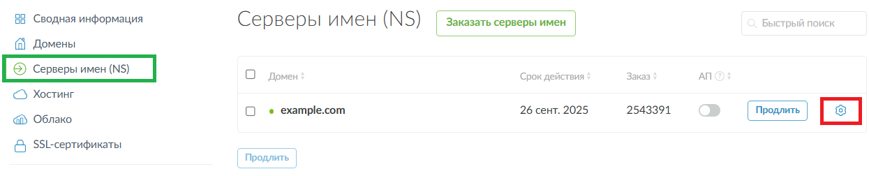 Если домен использует сторонние NS-серверы — добавьте записи у своего DNS-провайдера. Если в домене установлены серверы имен NIC.UA, перейдите в личном кабинет в раздел "Серверы имен (NS)".