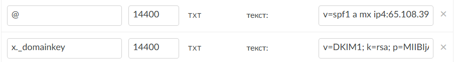 В этом разделе вы найдете значения DKIM и SPF записей для всех доменов, добавленных в панели хостинга