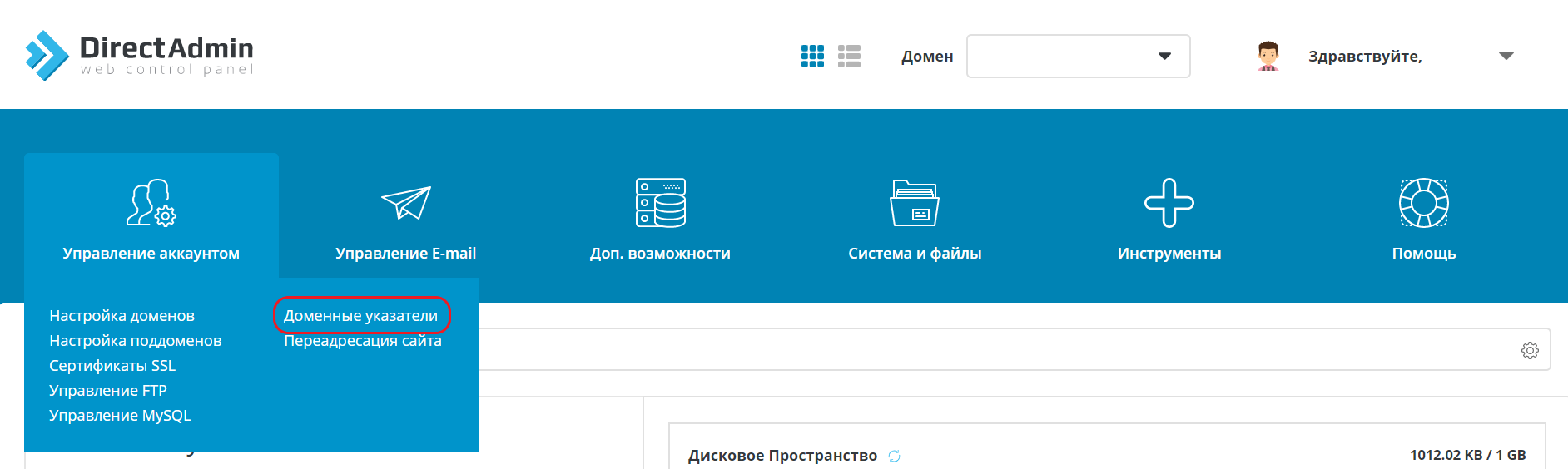 В панели DirectAdmin для этого присутствует раздел "Доменные указатели". Сначала перейдите в панель хостинга, в разделе "Управление аккаунтом" выберите пункт "Доменные указатели".