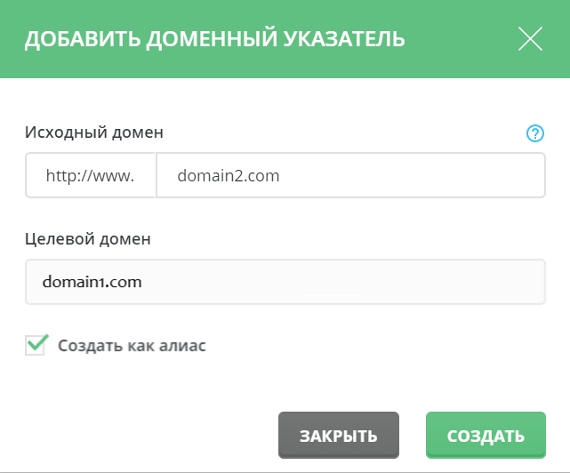 Затем в поле "Целевой домен" укажите основное имя сайта вместо 'domain1.com', в поле "Исходный домен" укажите вместо 'domain2.com' зеркальный домен (псевдоним). Затем нажмите кнопку "Создать".