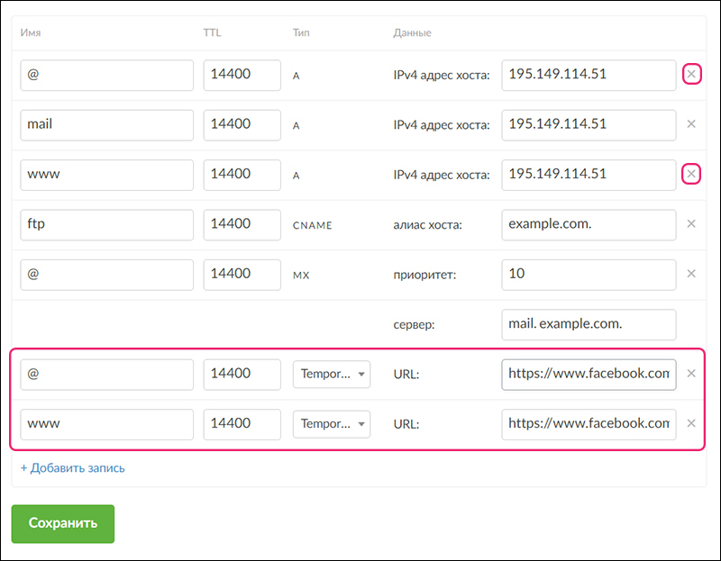 Откроется меню для редактирования и добавления DNS-записей. Скорее всего у вас уже будут существовать две записи с именами «@» и «www» и типом «А». Их нужно будет удалить, нажав на крестик в конце строки.