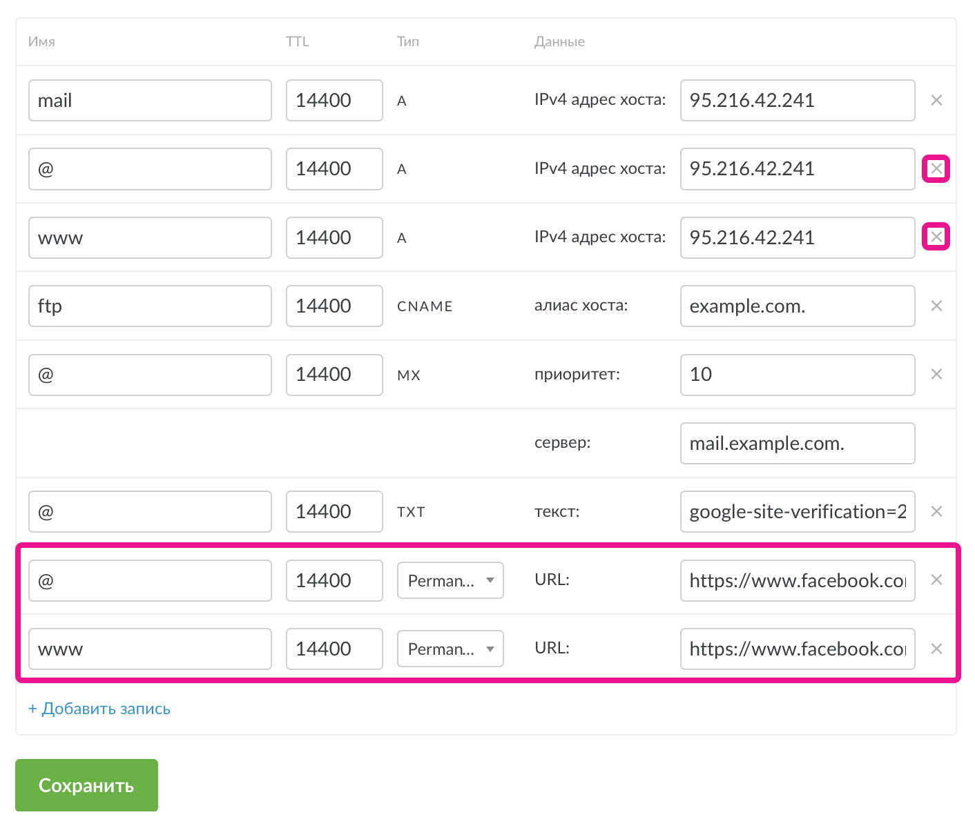 Откроется меню для редактирования и добавления DNS-записей. Скорее всего, у вас уже будут существовать две записи с именами «@» и «www» и типом «А». Их нужно будет удалить, нажав на крестик в конце строки.