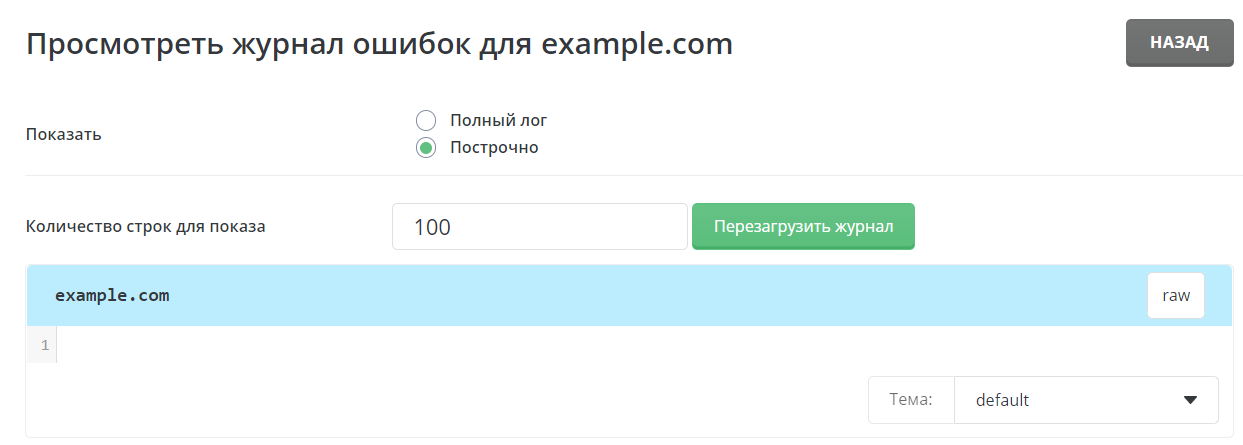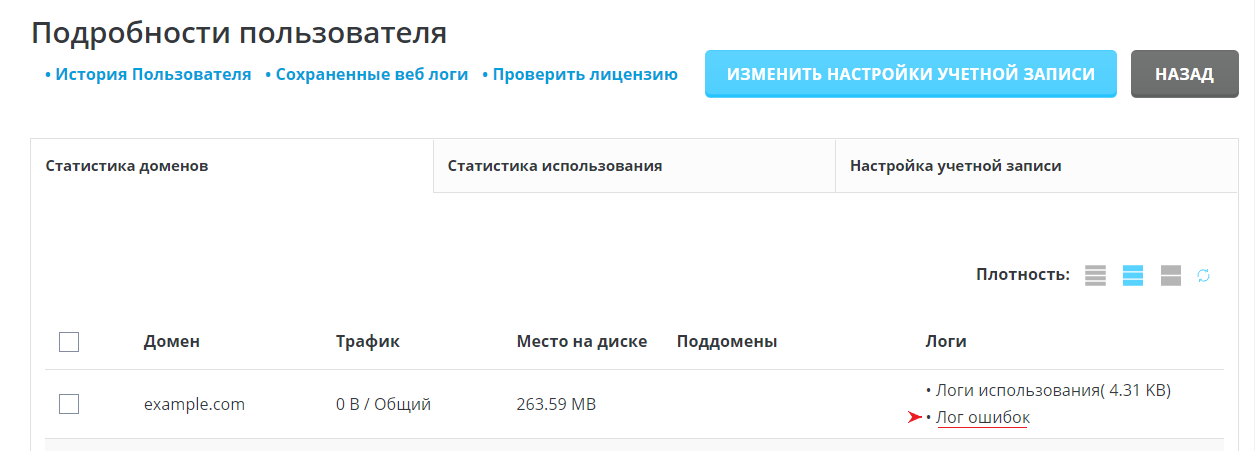 Внутри этого раздела выберите интересующий домен и нажмите в колонке "Логи" на пункт "Лог ошибок".