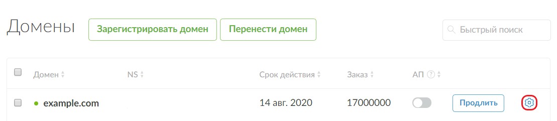 Сначала перейдите в раздел "Домены" личного кабинета и нажмите на кнопку в виде шестеренки возле заказа на нужный домен.